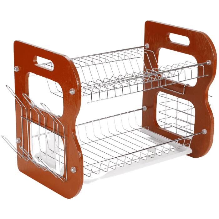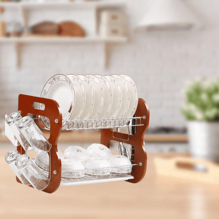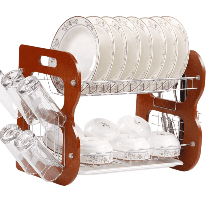 Πιατοθήκη διώροφη ανοξείδωτη με δίσκους αποστράγγισης και ειδικές σχεδιασμένες θέσεις για ποτήρια, κουτάλια, κούπες και μπολ. Μια πιατοθήκη διώροφη ανοξείδωτη με επένδυση ξύλινων χειρολαβών και πλαστικούς δίσκους για αποστράγγιση των σκευών σας.